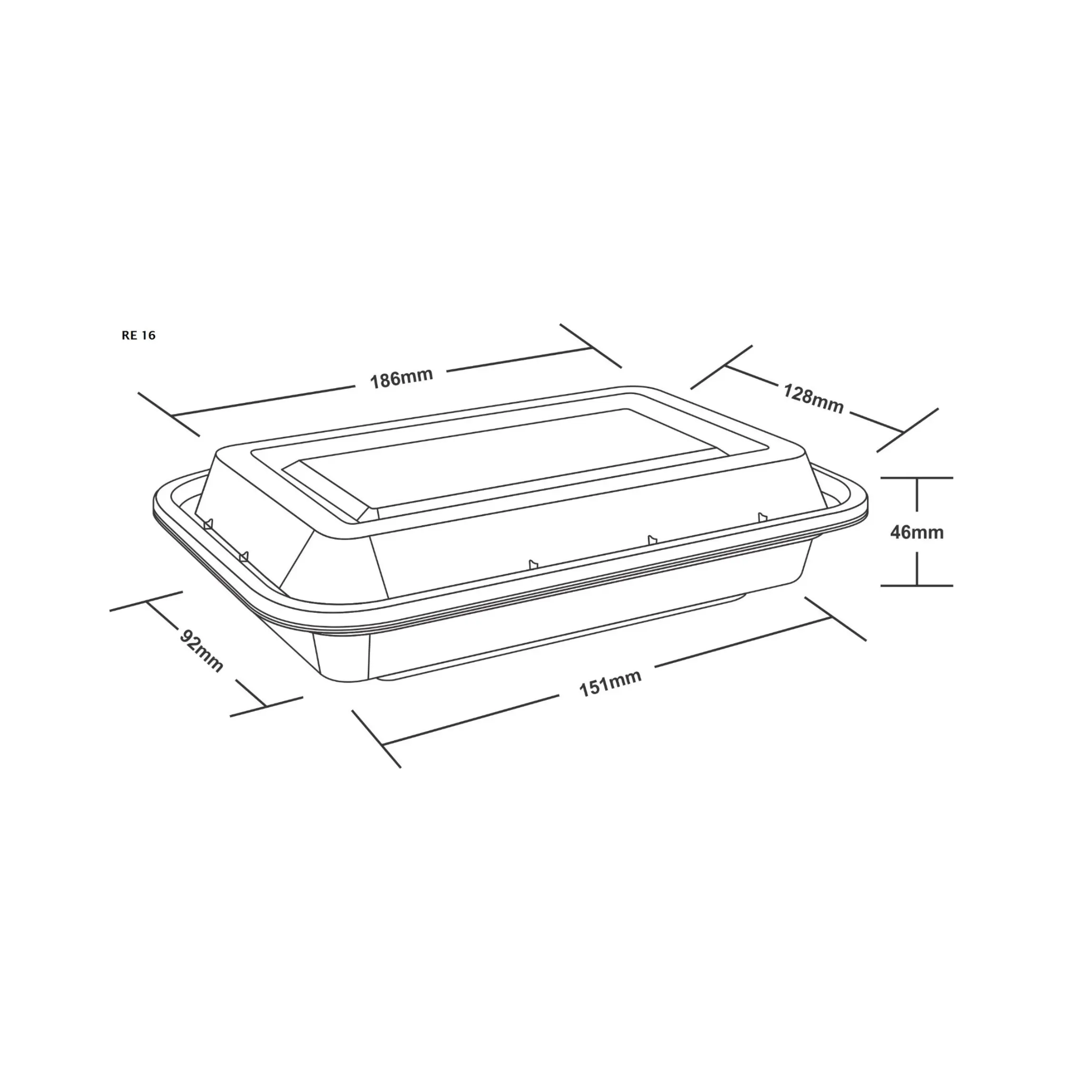Premium 16 oz Rectangle Domed Lid disposable food container made using PP food-grade plastic. Ideal for snacks, salads, curries, noodles, and export-ready meal portions. Strong, lightweight, and hygienic with a raised domed transparent lid designed for clean presentation and safe transport.